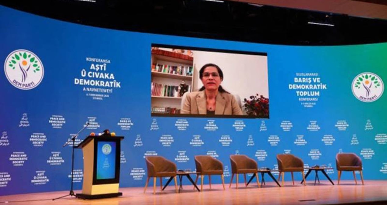 İktidarın gelmesine izin vermediği, kırmızı bültenle aranan terörist İlham Ahmed uluslararası konferansa telekonferansla bağlanıp, açılım sürecine övgü yağdırdı.