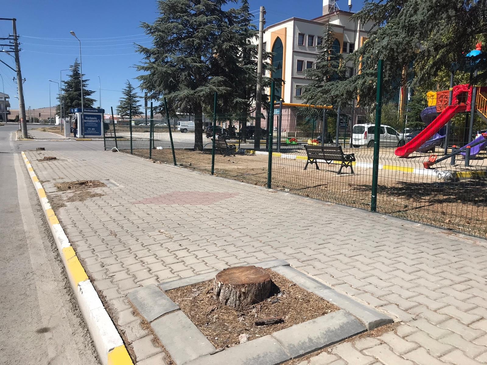 Cadde üzerinde yürütülen proje çalışması kapsamında kaldırım kenarına denk gelen 40-50 yıllık çam ağaçları gece saatlerinde sessiz sedasız kesildi.